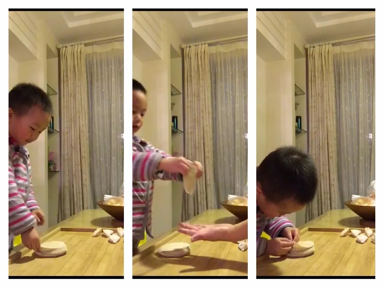 两岁多的小不点,看着我包饺子兴奋的要求加入,站在小板凳儿上学着我的样子,小心翼翼的将两张饺子皮分离,生怕戳破。在我包馅儿的时候,就两只小手儿拎着饺子皮儿耐心的等着,特别乖。一个完整的“运输”工作结束后,还不时地夸自己“真棒”。对于平时不爱动手的儿子,这个举动让我心里暖的不得了!孩子爸爸下班回家后,一家三口一起享用暖心饺子,真的很美味哦!