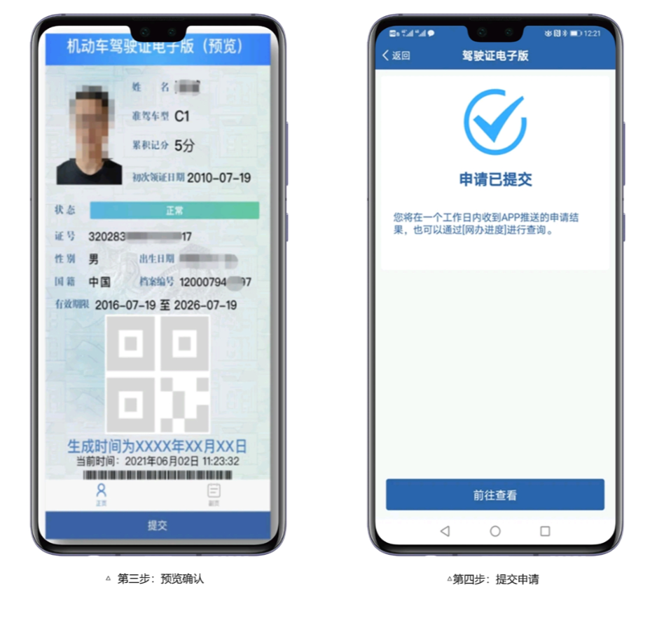 提交照片后,公安机关交通管理部门将在1个工作日内进行审核,对符合要求的,“交管12123”APP将生成电子驾驶证,并推送申请成功信息。