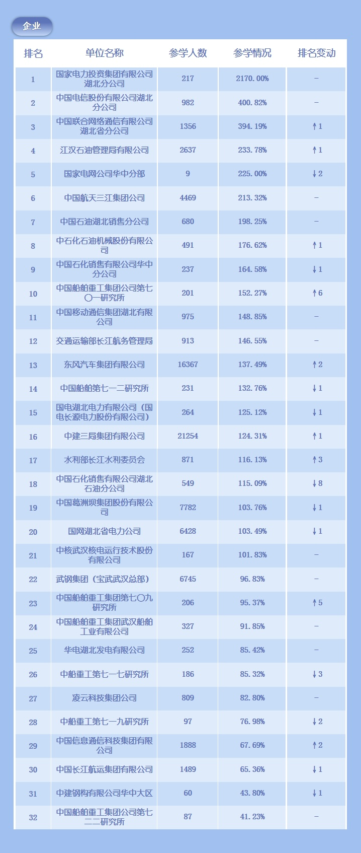 国家电力投资集团有限公司湖北分公司、中国电信股份有限公司湖北分公司、中国联合网络通信有限公司湖北省分公司、江汉石油管理局有限公司、国家电网公司华中分部等21个企业参学率达到100%。