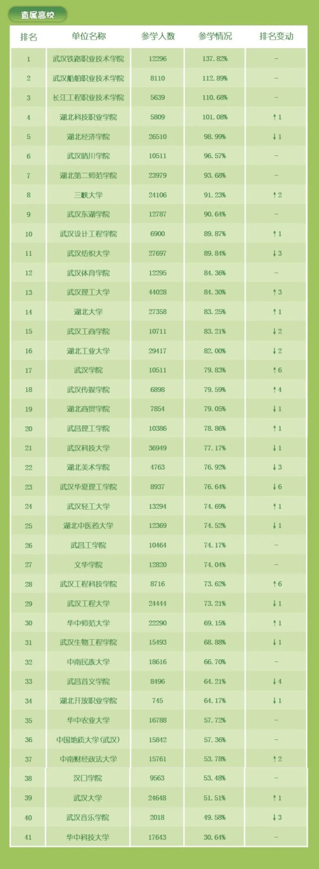 在直属大专院校团组织中,武汉铁路职业技术学院、武汉船舶职业技术学院、长江工程职业技术学院、湖北科技职业学院参学率均超过100%,排名位居第1至4名。