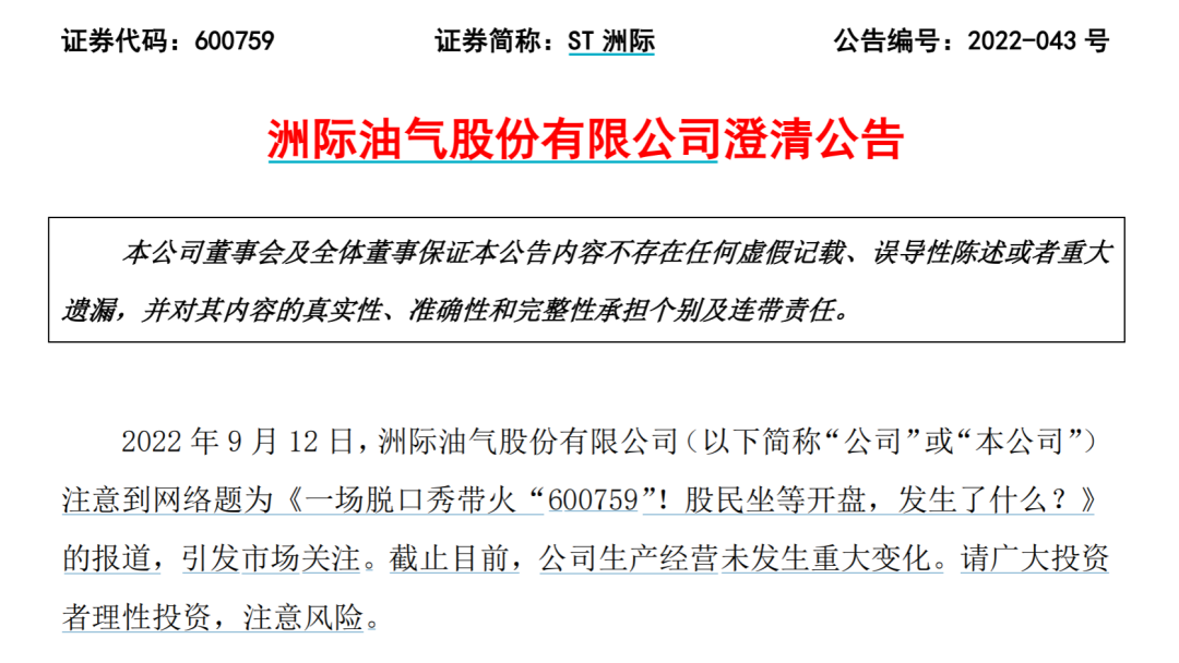 9月13日,A股迎来中秋节后首个交易日。中秋期间在某脱口秀节目中被提及的上市公司洲际油气股份有限公司(股票简称“ST洲际”)引发关注,并在13日以涨停价开盘。午间收盘后,上交所发布通报称ST洲际(600759)价格走势异常,依规对拉抬股票开盘价等异常交易行为采取了自律监管措施。业内人士表示,此事也给资本市场带来一些警示。