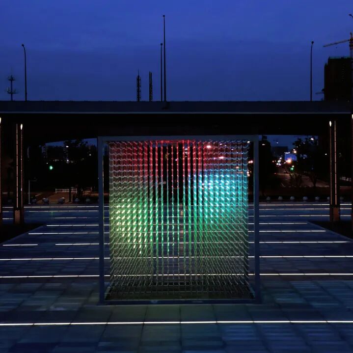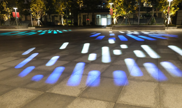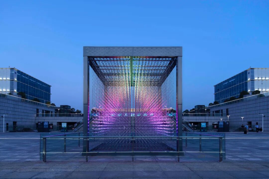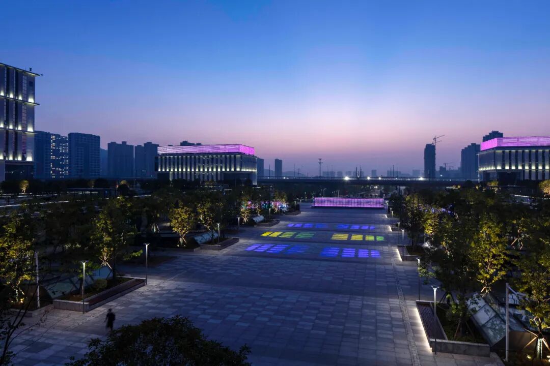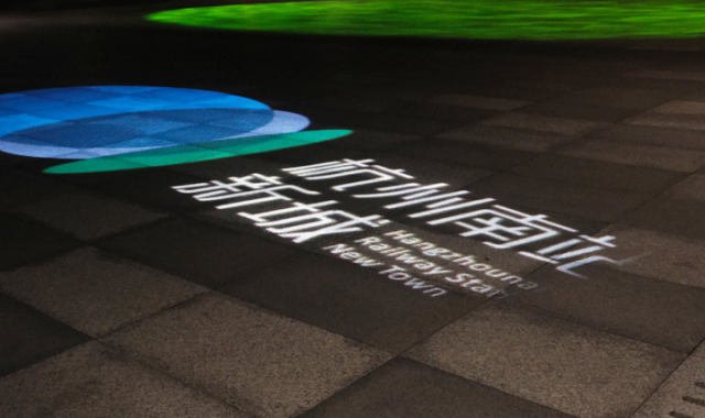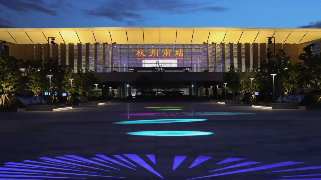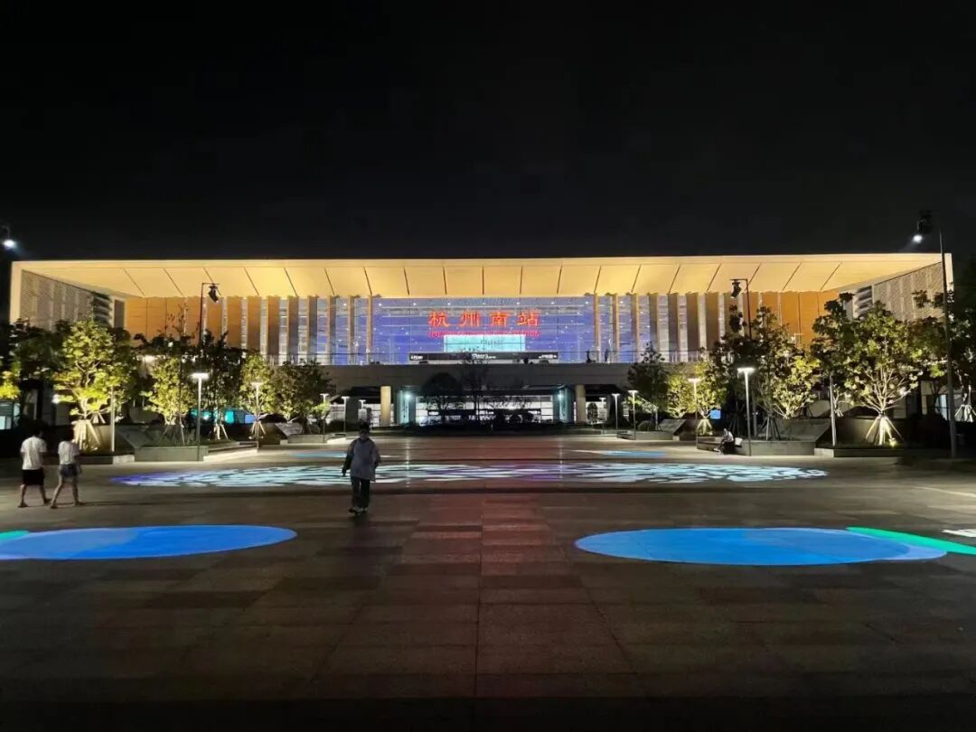 在东广场,杭州南站站房主体在远光投射灯的照明下,整体更显大气、庄重。光线勾勒着建筑的边缘,周边4幢产业楼宇光彩夺目,与广场地面的投影灯交相辉映。广场正中心,绚烂的3D珠帘屏不断变换,舞动的元素跃进画框,把南站夜景装点的五彩缤纷。