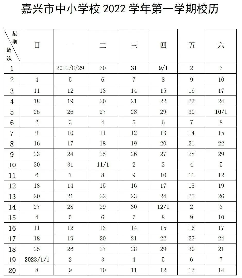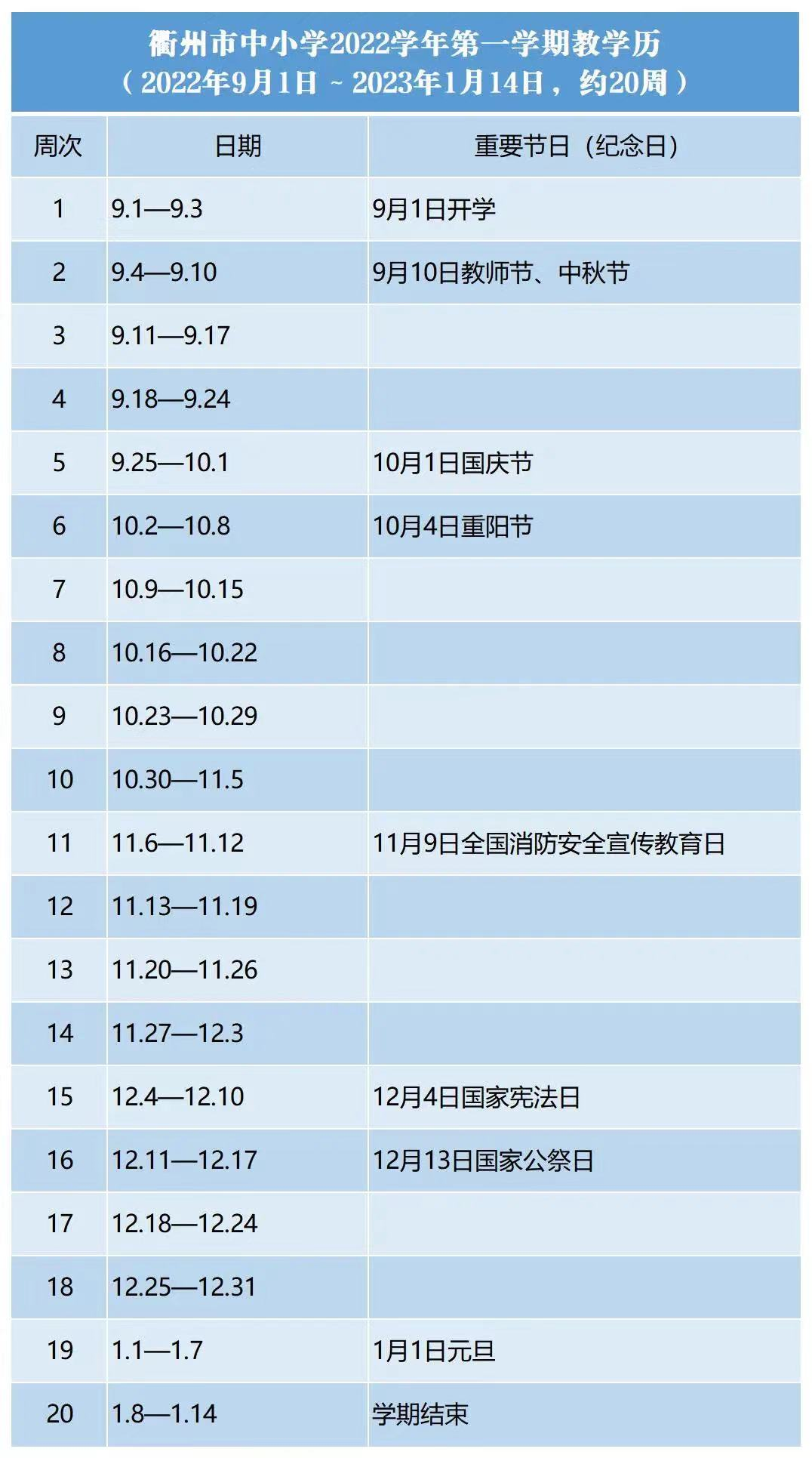 衢州市中小学2022年第一学期从2022年9月1日至2023年1月14日结束。