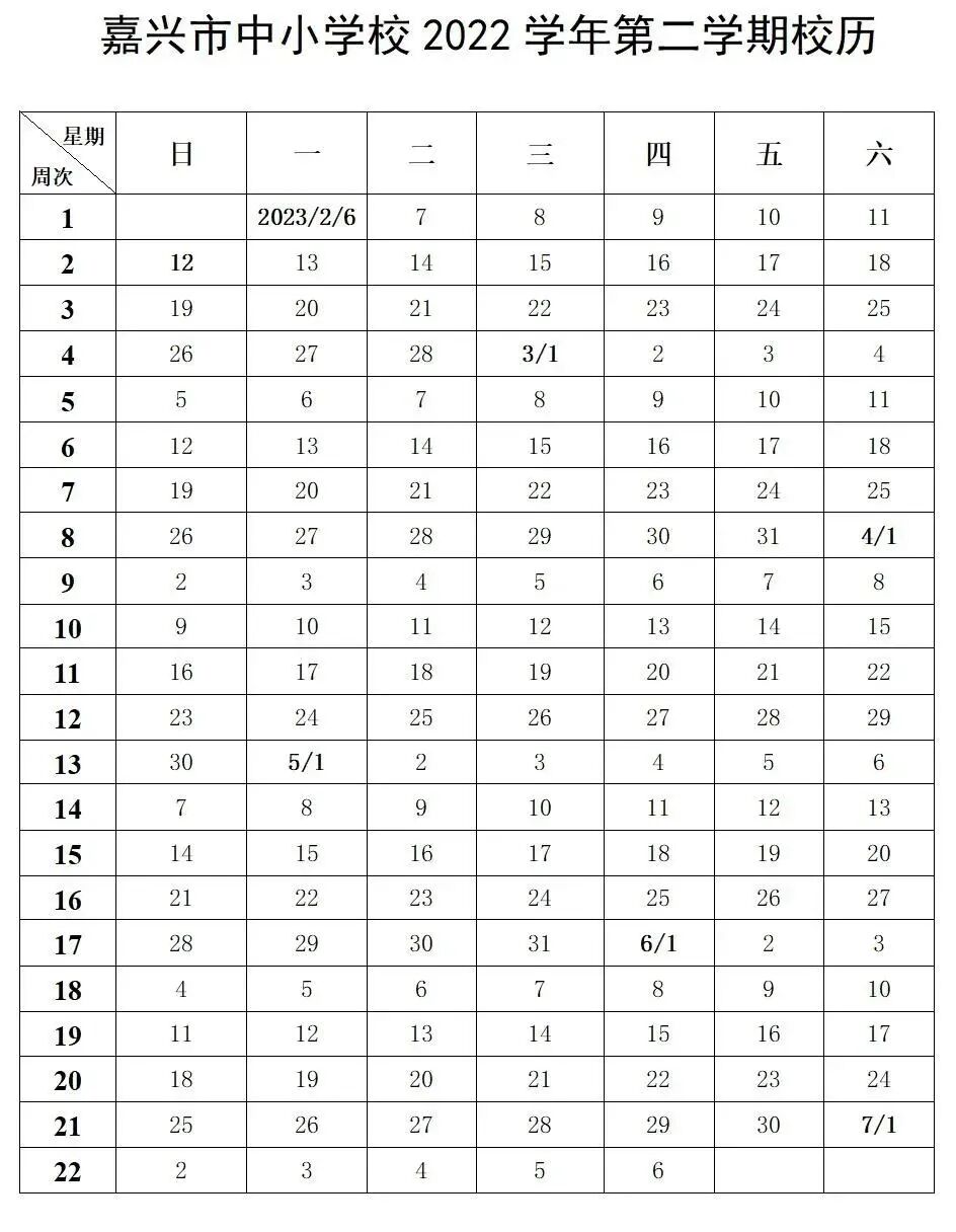 2022学年第二学期全市普通高中学校、中职学校(含技工院校)、义务教育中小学校、幼儿园、特教学校学生于2023年2月6日报到,2月7日开学。2022学年第二学期于2023年7月5日结束,7月6日暑假开始。8月29日暑假结束。