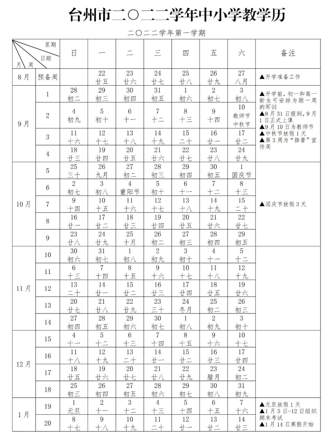 台州市中小学2022学年第一学期2023年1月5日—12日组织期末考试,1月14日寒假开始。