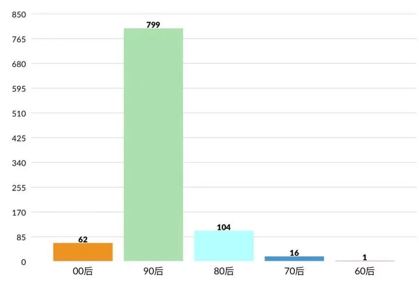 (00后共有62人,90后799人,80后104人,70后16人,60后1人。)