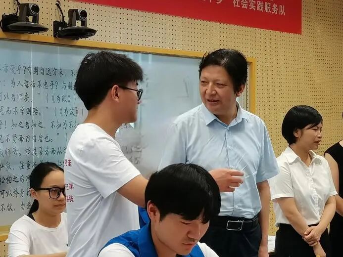 小篆课堂上,队员介绍了汉字的起源、汉字的演变和发展过程,教授小篆书写技巧,讲解其运笔间的笔画联系。项国雄依次观摩各组教学情况,对队员们将专业特长运用到实践教学中给予肯定。他指出,队员们的表现充分展示了文学院学子的风采,希望大家继续保持将所学所思转化为具体实践的行动力,在实践劳动中受教育、做贡献、长才干。
