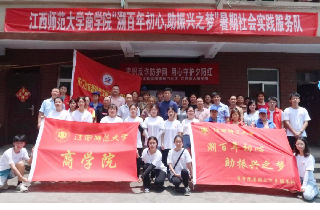在峡江县巴邱镇,董圣鸿看望了商学院“溯百年初心 助振兴之梦”社会实践队。该团队正在巴邱镇东门社区开展“织密反诈防护网 用心守护夕阳红”防电信网络诈骗宣传教育活动。队员们通过发放防电信诈骗手册、防电信诈骗情景剧表演、防电信诈骗案例宣讲,多措并举给当地居民带来了一堂生动有趣、贴近生活的 “防骗课”。