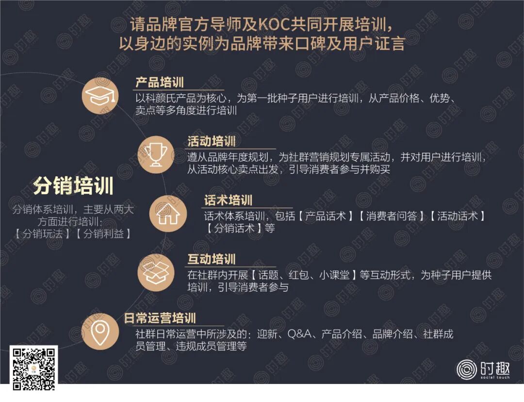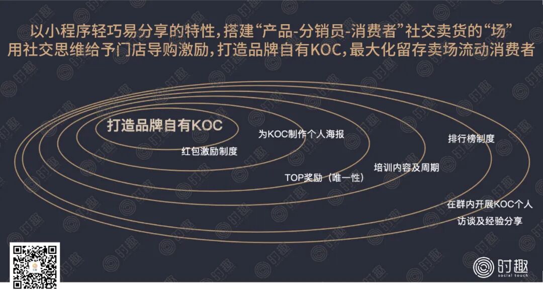 KOC作为备受关注的个体渠道,已经成为私域流量营销中破圈传播中重要的一环。在KOC养成中,品牌需要一套培训体系的搭建,不仅涉及到流量如何引导、引导去哪的问题,还涉及到各种知识和流程的培训,因此在时趣服务的过程中,将重点集中在两个方面:培养自有KOC和开展官方培训- 在打造品牌自有KOC过程中,依托微信小程序易于分享的特性,构建完整的“产品-分销员-消费者”的社交卖货场域,通过社交化思维给予相应的门店导购激励,让其主动发声成为品牌KOC。品牌将通过个人海报、红包奖励、TOP奖励、排行榜、个人分享等方式进行KOC激励。