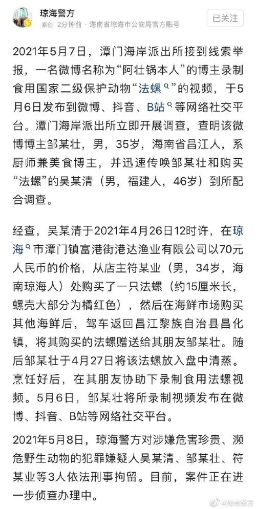 @海南警方 5月11日发文:琼海警方已对食用国家二级保护动物“法螺”的美食博主依法刑事拘留,请广大网友珍惜、爱护濒危野生动物,切勿以身试法。