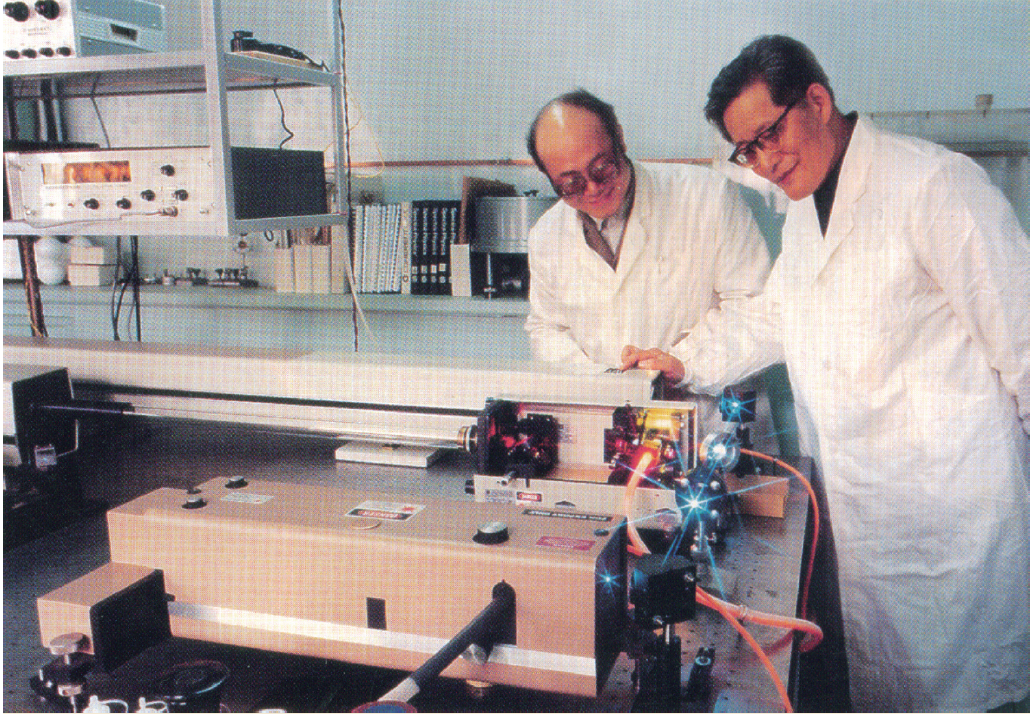 1983年2月,徐叙瑢先生在长春物理所能谱实验室同戴仁崧研究员检查PS激光系统