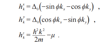 其中,我们将电子和空穴组成二分量的旋量,而ρ则是作用在该旋量空间中的三个泡利算符矩阵。因此,有效哈密顿量表示为赝磁场与赝自旋的作用,该磁场在动量空间中的分量为