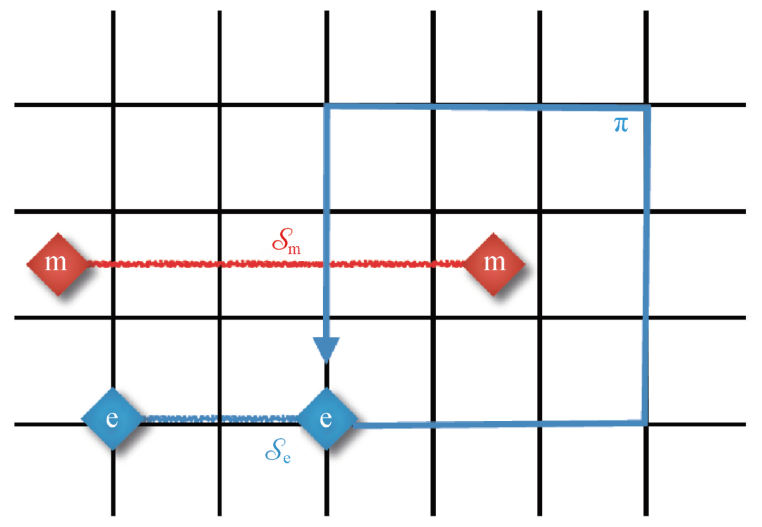 图7 弦算符激发的拓扑粒子及其统计关系。蓝色粗线代表电荷e弦,红色粗线代表磁通m弦,其各自末端为拓扑准粒子。可以验证电荷e弦环绕磁通m弦一圈后,发生Aharonov—Bohm效应导致π相位