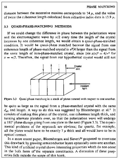 1974年正值“文革”之中复课闹革命时期, 有一天冯端翻阅物理系书架上新到的一本美国刊物《Laser Focus》(此刊登载了有关激光发展的新闻),其中有一篇题为“光二次谐波增强效应”的新闻, 简述了C. F. Dewey和L. O. Hocker利用ZnSe天然的聚片孪晶,获得倍频光强随孪晶片数 N线性增加的报道。 这一结果由于对聚片多畴的周期还没有精确控制,因而倍频光强还有改进的可能。 回家后, 冯端查阅手头的一本 F. Zernike与J. E. Midwinter合著的《Applied Nonlinear Optics》(John Wiley & Sons, 1973, New York), 其中 $3.3节(第 58页, 见图 2)论述了准相位匹配方法, 扼要地介绍了布鲁姆伯根Bloembergen的准位相匹配理论; 设想某一介质, 其非线性系数正负交替,片厚正好等于相干长度,聚片多畴结构可以实现倍频光强与N2成正比。 冯端进一步查阅了Bloembergen的原始论文:Armstrong, J. A., Bloembergen, N., Ducuing, J. Pershan, P. S., Phys. Rev.,1962, 127:1918及Bloembergen, N., Sievers, A. J., Appl. Phys. Lett., 1970, 17:483, 进行了核实后,冯端在理论方面已经心中有数了。 他在视察实验室中,发现生长的非线性光学晶体铌酸锂晶体的抛光表面的显微照片, 经常呈现条纹状正负交替的畴结构。 1975年, 冯端访问中国科学院物理研究所晶体室(室主任为陆学善先生,当时陆坤权同志临时负责)时, 他曾简单介绍了用生长铌酸锂聚片多畴晶体来实现准位相匹配的设想。 这也就是冯先生原始的idea。冯先生具有敏锐的洞察力, 善于捕捉国际科学上的前沿问题。