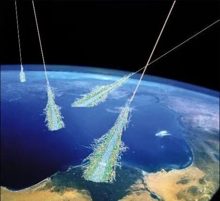首先从最上面,有来自宇宙的叫宇宙射线。宇宙射线主要是由核子、质子和α粒子组成,其余的还包括一些电子、伽马射线等等。当然也有我们非常非常难捕捉的大量的中微子,我们称作是“幽灵粒子”。