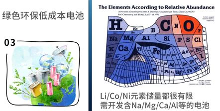 未来还需要研发什么样的电池?需要把电池工业做的更加绿色、更加环保、更加低成本。刚才演示的这些电池,都需要用到锂元素、钴元素、镍元素,在元素周期表上可以看到金属锂分布不高,钴和镍都属于比较稀有的元素,它们的储量很有限。像金属钴,在整个地球上主要出产于刚果金,这是一个政治上不太稳定的国家,所以金属的来源有问题。因此,电池领域都在开发含有其他元素,像钠、镁、钙、铝这些储藏分布更丰富的材料所做的电池,甚至利用有机材料、绿色生物质材料来做电池。