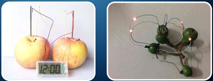根据伏打的结论,只要有两种不同的金属,有传导离子的媒介,很多东西都可以做电池,浸了盐水的纸也可以用来做电池。水果也可以做电池:水果电池。如下图。