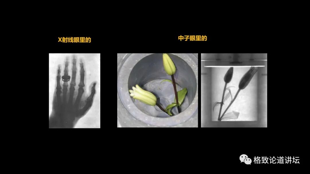 比如含有水分的新鲜花朵,把它放在金属容器里,中子打过去,就能非常清楚地看到里面花的景象。