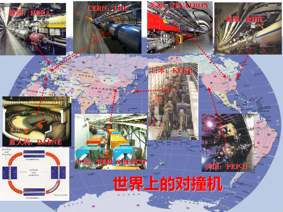 全世界有不同种类的对撞机和加速器。我这张图给大家非常简要的展示一下,在不同的地方,比如说像在美国、在瑞士、在德国、在日本、在意大利、在法国、在中国,都有过这样的对撞机。