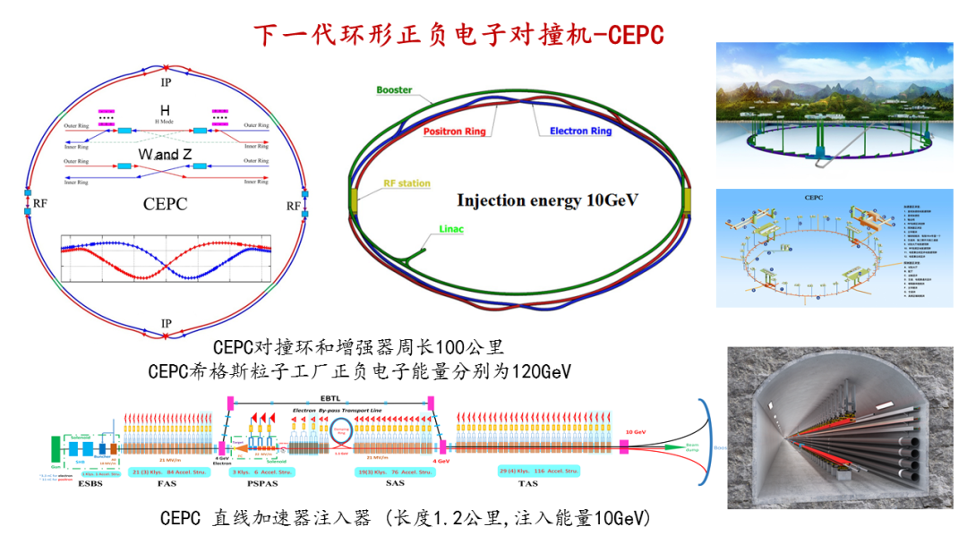 那么中国下一代对撞机的计划是怎么样呢?这就不得不提到2012年7月4号发现的希格斯粒子。刚才从一开始我就讲到这个是人类在物质深层研究的珠穆朗玛峰,这是皇冠上的明珠,这是科学的前沿,这是最重要的一个研究的题目。所以中国科学家在2012年的9月就提出要在中国建造下一代的环形正负电子对撞机来研究希格斯粒子。那时中国的科学家就动员起来,自2012年的9月到现在不断的在往前推进。环形正负电子对撞机我们管它叫CEPC。那么在CEPC运行之后,我们还期待着,就像CERN一样,在同样一个隧道将来还可以有更大的发展潜力,还可以考虑在隧道当中安装一台超级质子质子对撞机,叫做SppC。下一代的环形正负电子对撞机,正负电子是由一个直线的注入器(大概一公里多)注入到一个增强器当中,从增强器再注入到对撞环,再进行对撞。