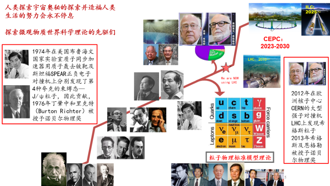 从这张图大家能够看到,我们有很多的知名科学家,从爱因斯坦到杨振宁、李政道、丁肇中,最后到希格斯——希格斯粒子的理论的创始人。在整个过程当中是一代接着一代的不懈的努力。但是在这个过程当中,科学的理论必须经过实验的检验。在我们今天讨论的课程当中,粒子物理实验需要通过什么来完成呢?需要通过加速器和对撞机。待会我会给大家仔细地来介绍。