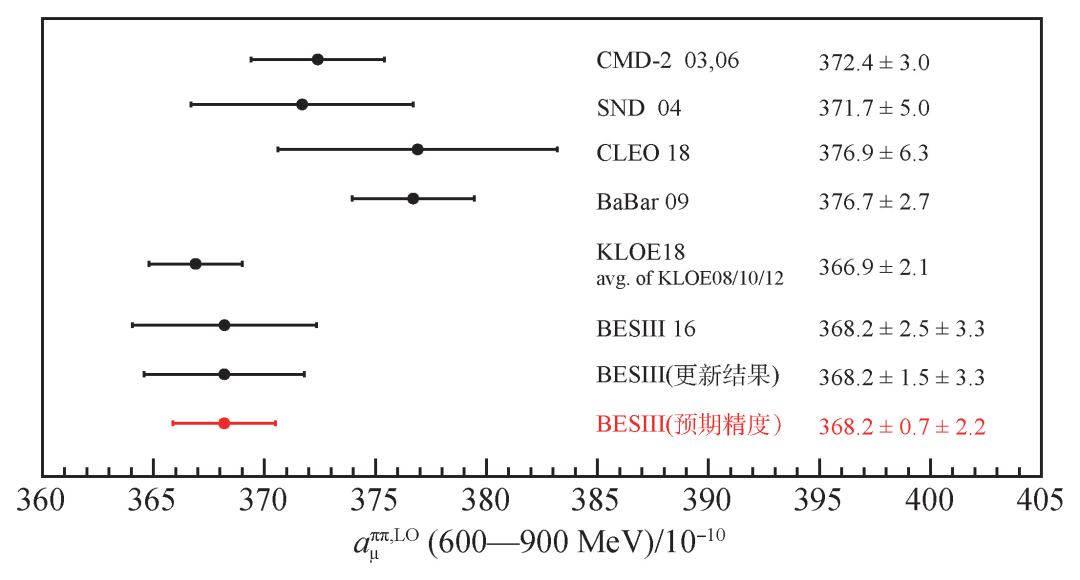 BESIII实验利用BEPCII在3.773 GeV收集的2.93 fb-1数据,通过初态辐射方法测量了能量范围为600—900 MeV的π+π-截面[9]。结果与KLOE的实验结果更接近。BESIII的结果主要受系统误差限制,系统误差来源主要是亮度测量0.5%和辐射修正0.5%。若通过测量π+π-与μ+μ-的截面比值,能够消除这两项系统误差以及真空极化修正的系统误差,将显著减小系统误差。然而囿于当前亮度下μ+μ-过程的统计量,该方法受限于统计精度。BEPCII将继续在3.773 GeV能量取数,预计积分亮度达到20 fb-1 [10],μ+μ-的统计精度将提高2—3倍。特别地,如果安装上小角度晶体探测器,能够重建出辐射小角度光子的事例(初态辐射过程中光子大部分沿束流方向,即小角度辐射),μ+μ-的统计误差能够降到极小。假设保持其余各项系统误差不变,总的系统误差为0.55%(这还仅是保守的估计,因为有些系统误差来源如径迹效率等和统计量相关,误差还能够进一步降低)。BESIII上利用3.773 GeV的积分亮度为20 fb-1的数据,通过测量π+π-过程对缪子反常磁矩的预期贡献如图5所示。