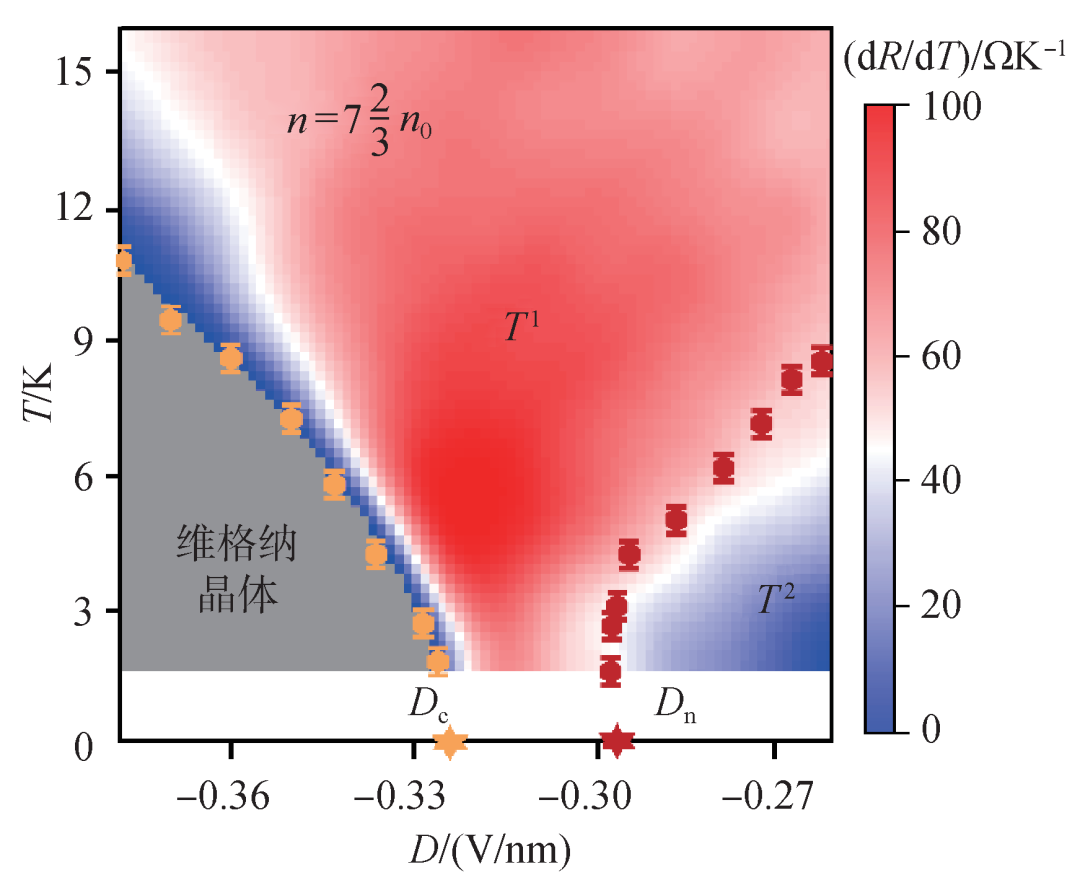 图3 量子赝临界行为。dR/dT的电场—温度相图,量子临界区域(T1区域)只在临界温度(黄色五角星标识)之上出现。在临界温度之下时,自旋自由度被“冻结”,量子临界性失效量子临界区域中出现的奇异金属行为在魔角双层石墨烯体系中已有报道[4],并被归因于能谷自由度的量子涨落效应[5]。但在我们的工作中,奇异金属区域随着平行磁场下自旋的极化而收缩,表明自旋量子涨落在奇异金属态的形成中起主导作用。临界中间态区域亦随着水平磁场变小,说明该量子基态是自旋非极化的。而在高平行磁场下量子赝临界现象的出现,表明此时广义维格纳晶体和费米液体之间的金属—绝缘体转变是一种介于连续量子相变和一阶量子相变之间的弱一阶量子相变[2,3]。当温度在高磁场诱导的自旋塞曼能标T *之下时,自旋自由度被有效“冻结”,导致临界标度行为的失效;而当温度大于T *时,热激活能将冻结的自旋“融化”,系统又恢复量子临界性。值得注意的是,量子赝临界性和弱一阶量子相变已经在量子自旋液体的相变理论中得到了广泛的讨论[6],并在最近被引入到SU(2)广义维格纳晶体的量子融化理论中[7]。这项研究有望促进对包括弱一阶量子相变在内的多种量子相变机制之间竞争的深入理解。![]()
