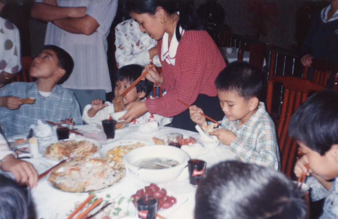 在我们家族里面,每一种聚散离合最终都会变成这样的一桌宴席。在家宴上,小朋友们会单独坐在一桌,大人就站在后面给小朋友们夹菜。这个碗里被夹进一筷子粉丝的小女孩就是我: