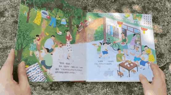 打完小枣之后,我们就来到池塘边看奶奶采菱角。这一页要竖起来观看,有一个水上水下的效果,水下有遗落的搪瓷茶缸,还有搓衣板。