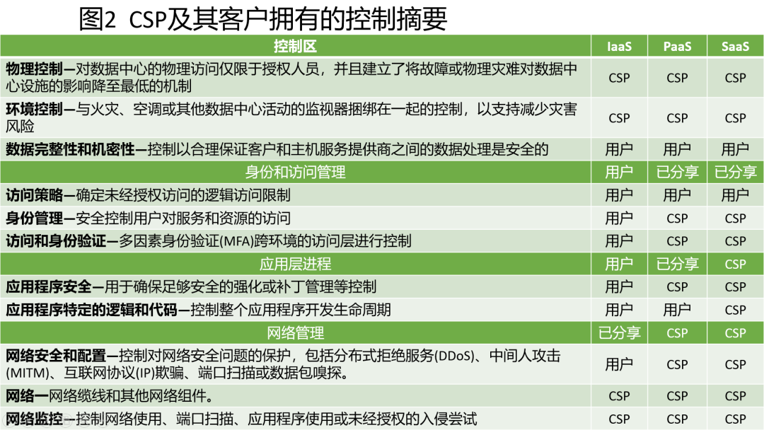 图2提供了每个模式中典型云服务提供商与其客户拥有的控制的摘要。