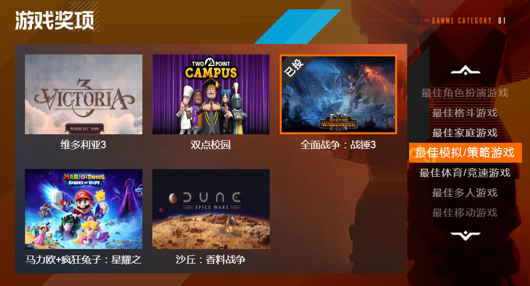 只能投战锤3了,其他的我毫无体验和发言权。话说《三角战略》为啥没被分类在这个奖项里?