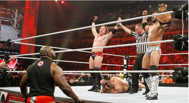 但是在当时,韦德·巴雷特带领的“核心军团”横行霸道,2011年2月22日的RAW,约翰塞纳和米兹有史以来第一次携手合作,共同挑战“核心军团”成员贾斯汀·加布里尔与希斯·斯莱特的双打冠军头衔,在当时,台下有虎视眈眈的核心军团其他成员,约翰·塞纳又要在即将到来的《摔角狂热》上挑战米兹的WWE冠军,就是这种情况下,两人还真的拿下了双打冠军头衔,但是帅不过三秒,就被军团首领韦德·巴雷特要求重战赛输了回去!