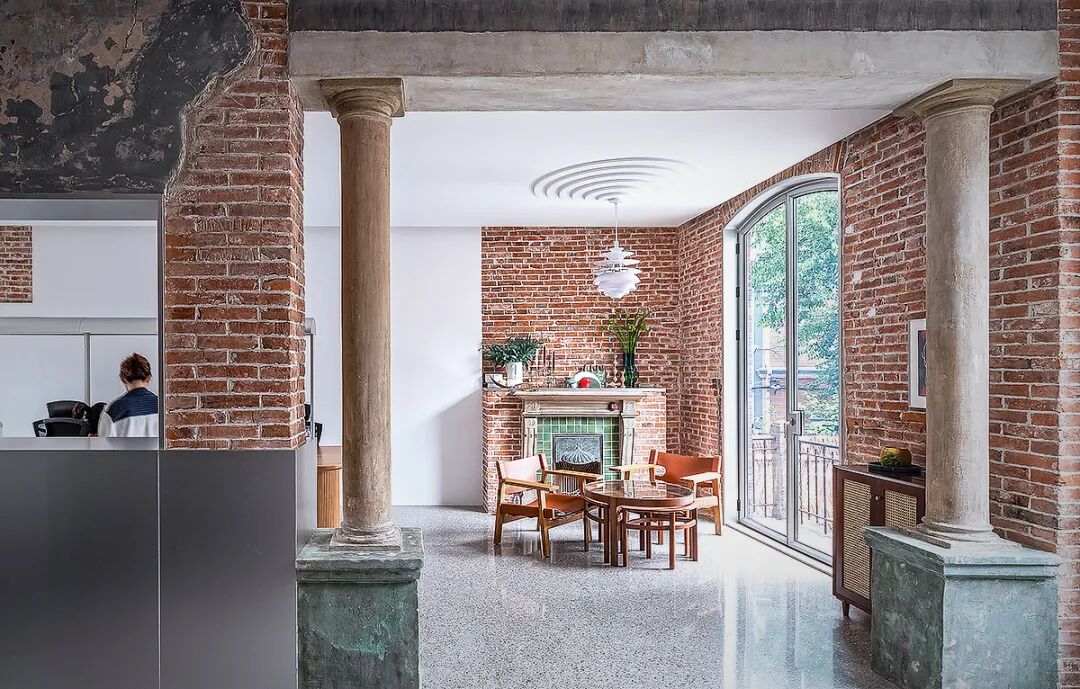 原是1936年法式风格的老洋房,处处都是时间痕迹的叠加。修缮不是为了清除那些痕迹,而花更多心思在如何把老味道留存下来。为让余味更悠长,甚至会花大力气把有些煞风景的新材质藏起来。比如,易腐朽的砖木结构不声不响地换成钢筋结构,外观寻不到一点端倪。而,完整保留下的旧楼梯、壁炉、罗马柱,几处斑驳的墙皮支起了整体建筑视觉叙事的灵魂。