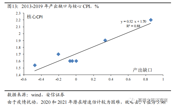 下图13报告了我们计算的2013-2019年期间产出缺口与核心通货膨胀之间的关系,其中产出缺口的计算方法在附录中,基本想法是计算特定年份前后各两年的均值。考虑到2020年以来疫情的影响,这段时间没有包括在样本中。