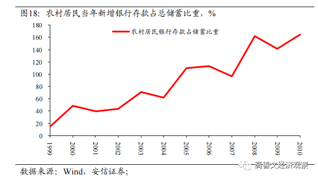 我们计算农村居民储蓄存款占其总储蓄的比例,以此来衡量农村居民的收入结余在多大程度上成为银行体系融资过程的一部分。