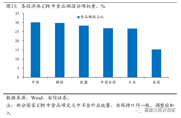 国际比较也支持了这一点。如下图15所示,中国居民的食品烟酒在消费支出中的占比已经和欧盟、日本、韩国、中国台湾等高度发达的经济体接近。
