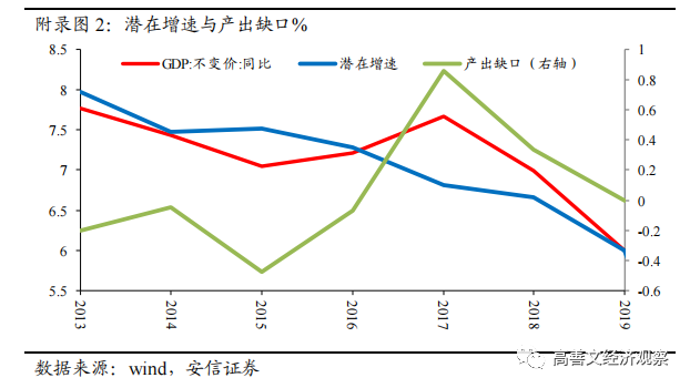对于产出缺口的计算,我们采用移动平均方法计算出当年的潜在增速。使用前两年和后两年GDP增速均值(共计4年)作为当年潜在增速。在估计2018和2019年潜在增速的时候考虑到2020年和2021年的异常,假设在无疫情的情况,2020和2021GDP增速分别为5.75%和5.5%。