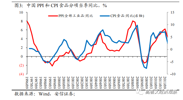 第二个重要的事实是,1996年到2012年期间,中国的食品价格与工业品价格的波动是高度同步的,相关系数达到0.77。