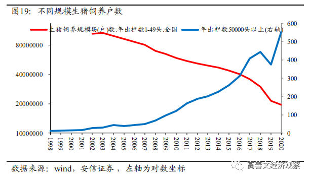 总体上,如图19所示,在过去20多年的时间里,散养的数量在持续下降,而集中养殖在持续上升,但是散养的急剧下降发生在2015年前后。