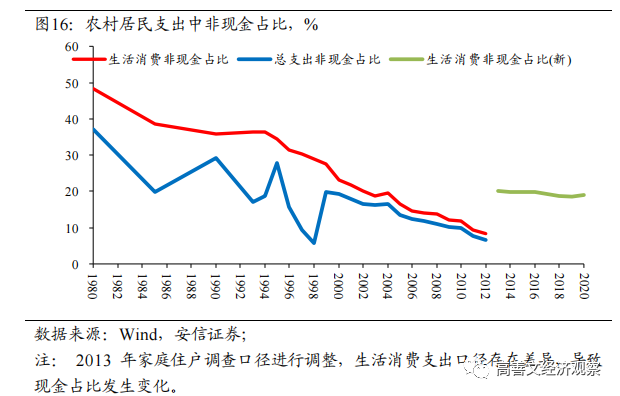 如上图16所示,1980年农村居民在生活消费中大约一半是不需要现金的,2012年(生活消费非现金占比)下降至10%,新口径下为20%。这代表农户部门80%的生活消费品都需要去购买,是市场分工和交易体系的一部分。