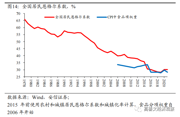 1978年以来,由于中国经济的快速增长和人均收入大幅度上升,食品开支占居民支出比重从65%下降到30%以下,恩格尔系数的显著下降(见图14)反映了生活水平的快速提高。