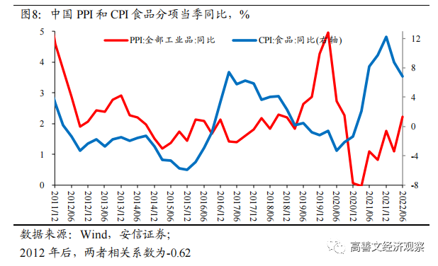 如前节所述,在1996到2012年期间,中国的食品价格与工业品价格的波动高度同步,但是如下图8所示,2012-2022年期间这种同步性消失了。