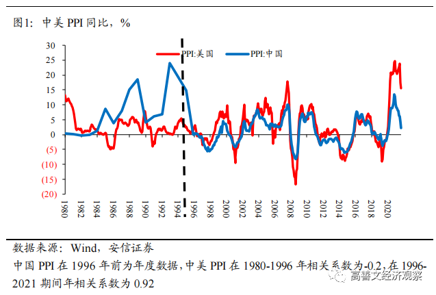 1996年后,中国和美国工业品价格开始表现出极其紧密的联系,相关系数从-0.2上升到0.92。在这26年的时间里,每一轮工业品价格的上升和下跌,在中美之间都是完全同步的,甚至在很多时候顶部和底部幅度都很接近。