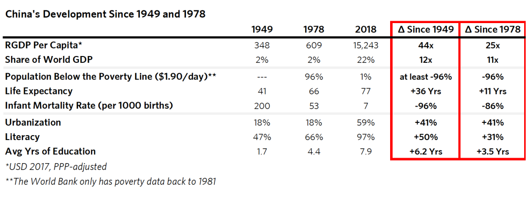 其政策的结果反映在下表中,该表仅显示了一些代表性统计数据。他们和大多数其他统计数据都令人印象深刻。例如,人均产出增加了25倍,生活在贫困线以下的人口比例从96%下降到不足1%,预期寿命平均增加了10年,平均受教育年限增加了大约80%。我可以没完没了地列举几乎每个领域同样令人印象深刻的统计数据。中国现在在许多领域显然是美国的竞争对手。