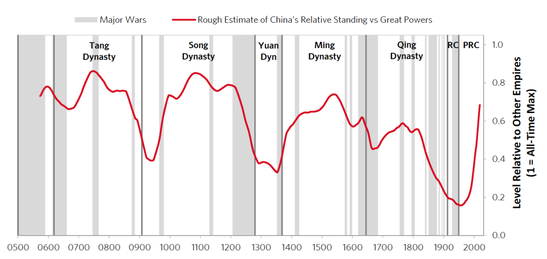 在过去的两年中,我还研究了中国历史,这是我研究帝国及其货币的兴衰的一部分,目的是总结出关于帝国兴衰更迭的普世规律,并帮助我理解受历史影响很大的中国人,是如何思考的。我在研究团队的帮助下进行了深入研究,并与世界上一些最博学的中国、美国和非美国学者以及从业者进行了相互验证,从而完成了这项研究。
