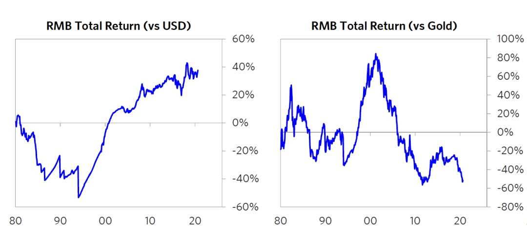 关于货币价值,下图显示了自1948年人民币问世以来以美元计算的人民币价值。如图所示,直到1971年a)美元对黄金和其他多数货币贬值,包括人民币和b)所有货币对黄金贬值,包括人民币。