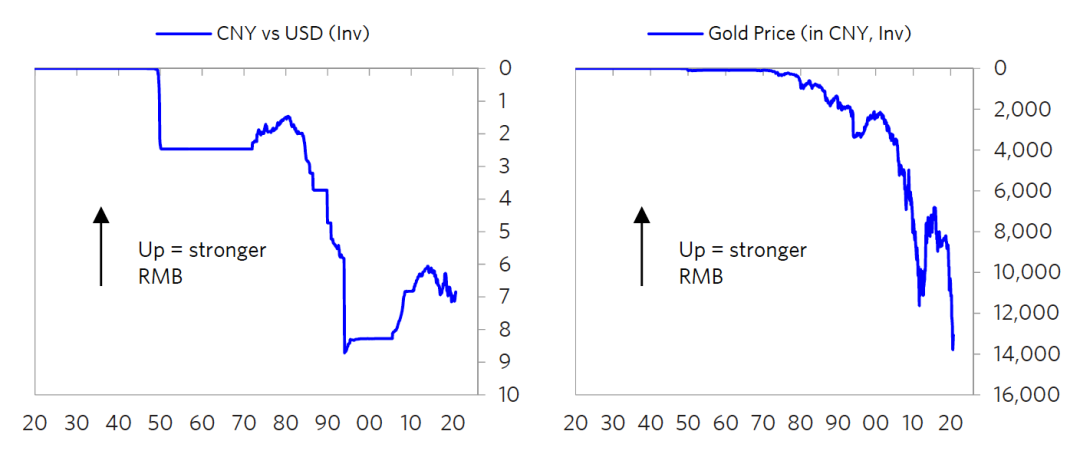 那时,中国以及美国和大多数货币实行法定货币体系,通货膨胀率加速上升。人民币对美元的最初升值损害了出口和经济,从而导致人民币在1980年至1994年期间贬值了83%(或每年约12%),这使这一时期的平均通货膨胀率上升至7.8%。从1997年到2005年,人民币一直坚守在每美元8.28元,尽管没有自由交易。2005年7月,人民币与美元脱钩,以一篮子外币进行管理(每美元起价8.11元人民币)。自那时以来,人民币一直有一定的波动,但一直没有跌破2005年的汇率(取消钉住汇率)。左图以美元为单位显示现货价格,右图以黄金为单位显示现货价格。如图所示,自2014年以来,人民币兑美元汇率已经下跌了一点点(每年约2%),而人民币兑黄金汇率则下跌了更多(每年8%)。