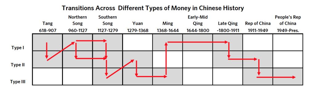 正如所解释的那样,随着历史上的每一个缺点变得无法容忍,这些问题在历史上从一个变为另一个。下图显示了这些货币体系自唐代以来在中国历史中的变化情况的极简图。[10]