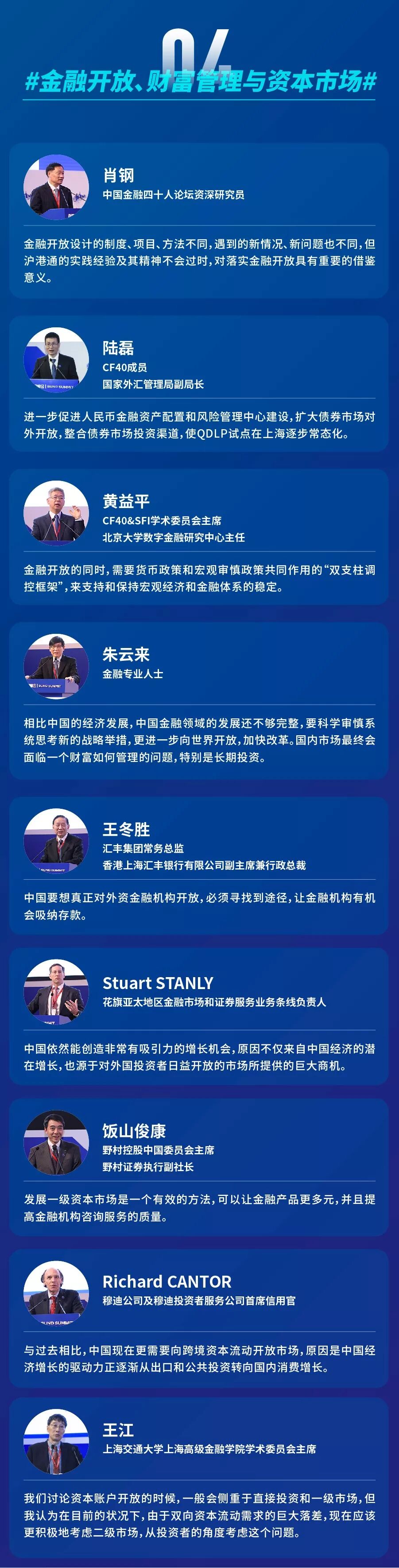 峰会坚持“非官方”、“国际化”、“专业化”定位,聚焦金融开放、金融科技、资产管理等议题, 通过高水平的思想碰撞与观点交锋,分享真知灼见,以对话推动共识,以共识推动合作,为建设开放型世界经济提供高质量的智力支持,助力上海国际金融中心建设再出发。