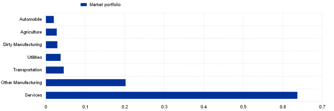 Papoutsi等人的文章(2021)继而将市场投资组合的行业分布与欧洲央行根据其企业行业购买计划(CSPP)所持有的现有资产进行比较,显示出投资组合的行业构成存在明显差异。服务部门在欧洲央行组合中的代表性不足,而制造业、公用事业、汽车和运输部门相对于市场组合的占比过高(图2)。